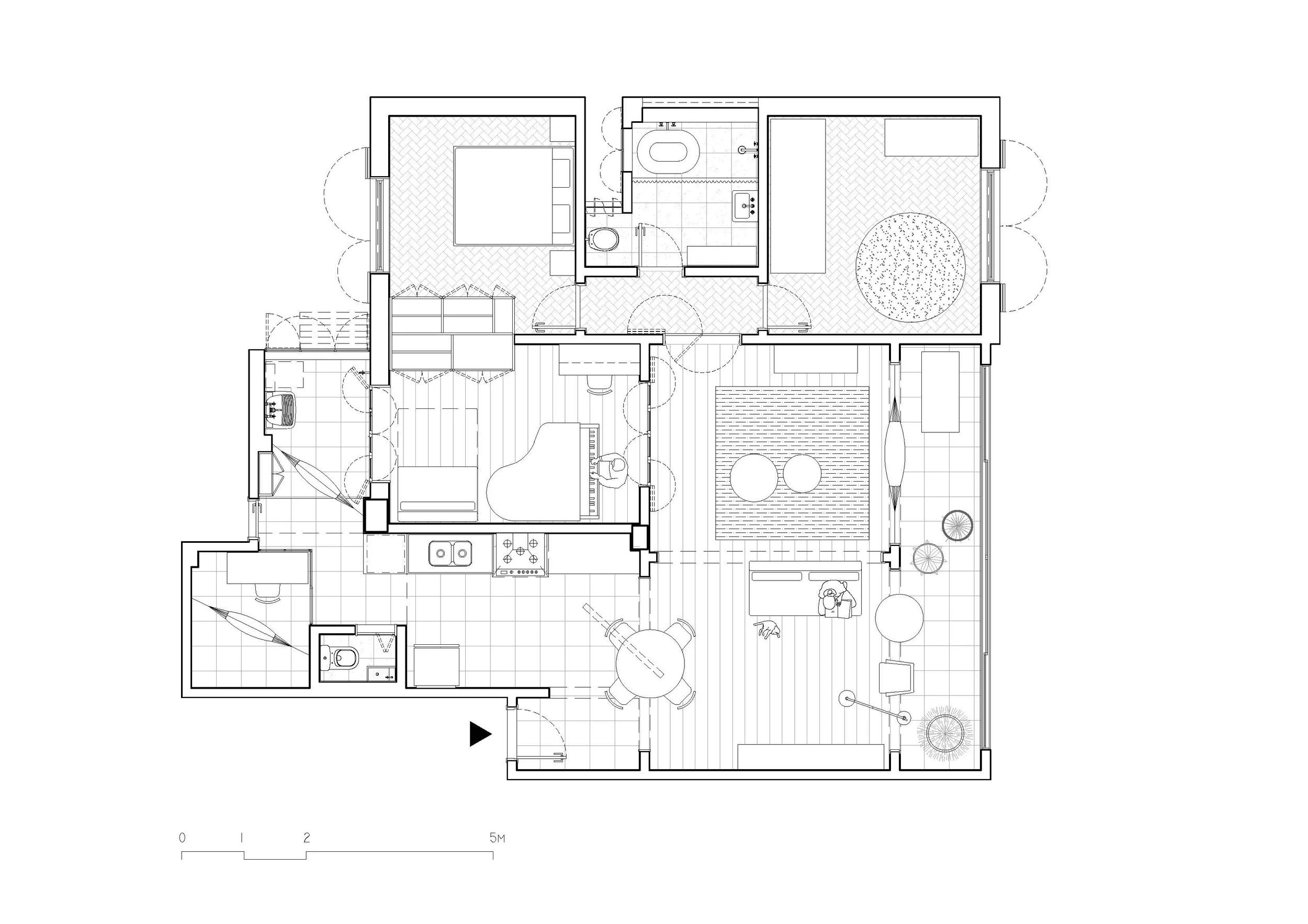 O apartamento apresentava ótimas qualidades: vista para a mata, uma sala ampla e uma planta baixa que suportava modificações no sentido de integrar os espaços antes segregados e criar uma circulação mais livre por toda a casa. Os moradores - um casal jovem e uma criança pequena - e suas práticas cotidianas demandavam limites eficientes para que pudessem conviver o trabalho doméstico, o cuidado, os estudos, as aulas de música, a ioga, as bricadeiras, entre tantas outras atividades.