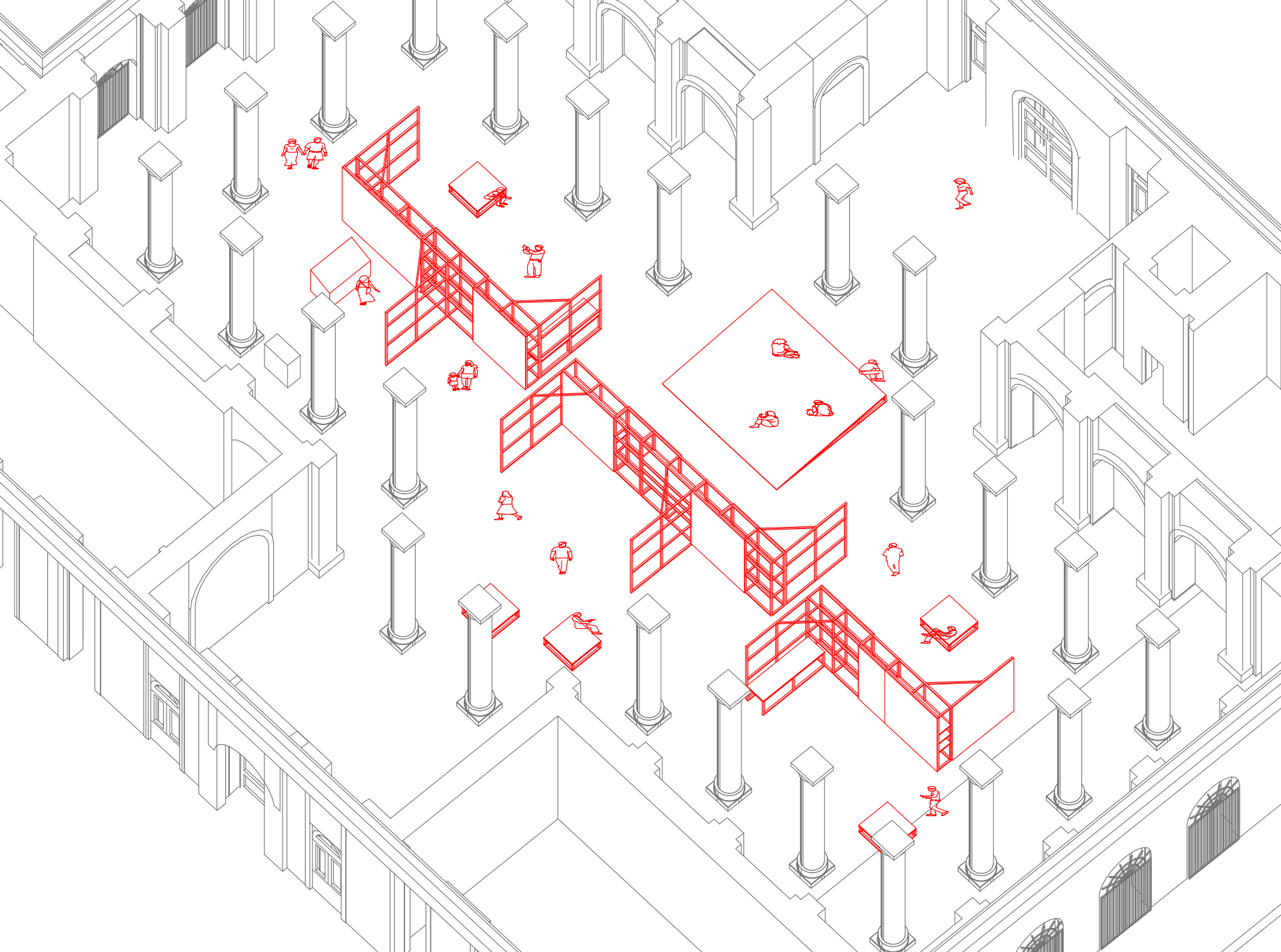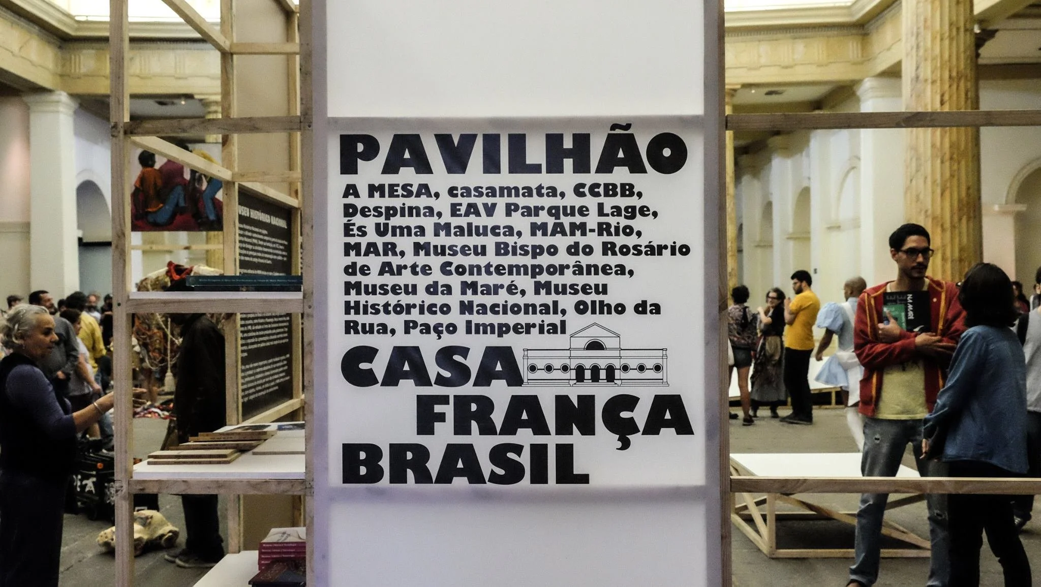 A mostra “Pavilhão” convidou treze instituições cariocas, dentre elas museus, galerias e espaços independentes, para ocupar durante um mês a Casa França Brasil. Propusemos como estratégia de ocupação do espaço uma estrutura vazada, auto-portante, concentrada no centro do espaço expositivo de forma independente da casca-casa.
